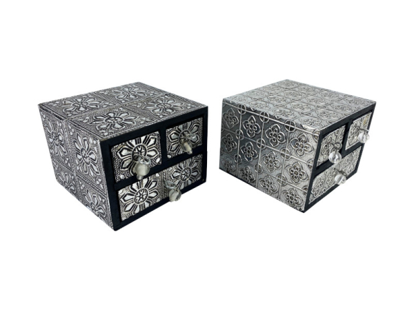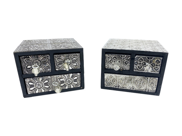 Das kleine Schränkchen mit 2 kleinen Schubladen und einer großen Schublade ist mit geprägtem Silberblech belegt. Das Dekor hat ein indisches Rosettenmotiv und ist eine Miniaturreplik einer klassischen indischen Landhauskommode.