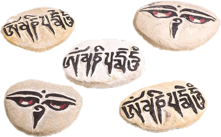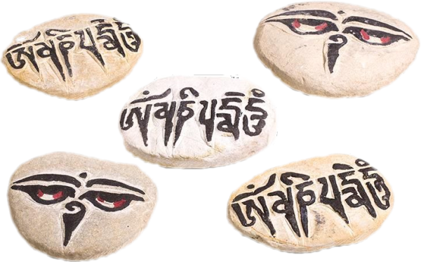 Handarbeit von tibetischen Flüchtlingen in Nepal hergestellt: Mani Steine mit diversen tibetischen Abbildungen und Symbolen.