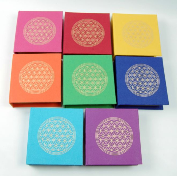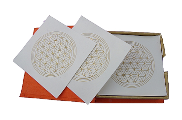 Memo Pad mit ca 120 Blatt handgeschöpften Papier. Einseitig mit einem Golddruck der Blume des Lebens. Die Blätter haben eine Größe von 9,5 x 9,5 cm und sind in einer schönen farblich sortierten Klappbox. Auf dem Deckel ist ebenfalls ein Golddruck mit der Blume des Lebens. Die Box hat eine Größe von 12 x 11,5 cm.