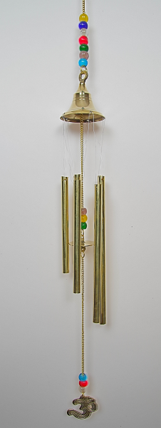 Windklangspiel aus Messing mit wohlklingenden Röhren, die an einer Glocke hängen. An der Verlängerung des Klöppels hängt ein Omzeichen. Durch Wind oder Bewegung entsteht so ein harmonisch abgestimmtes Klangspiel mit hellen und klären Klängen.