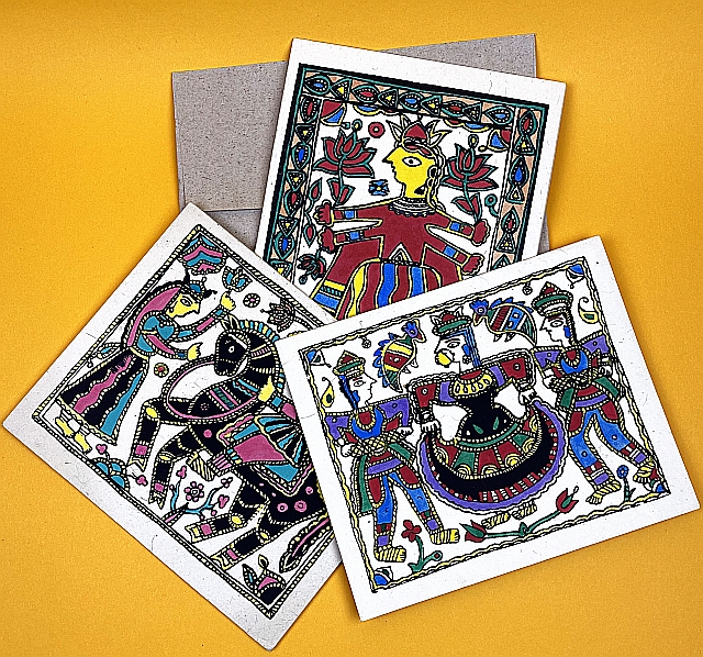 Die Karten werden in Bangladesh im Siebdruckverfahren auf handgeschöpften Papier hergestellt. Die volkstümlichen Motiven stellen Szenen aus der Mythologie und aus der Sagenwelt dar. Jede Karte ist ca 17 x 14 cm groß und wird mit einem Umschlag aus handgeschöoften Papier geliefert.