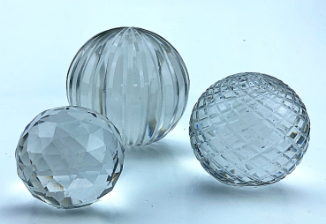Schöne geschliffene und gravierte Glaskugeln mit abgeflachtem Boden zum sicheren Stand. Sehr dekorativ für Schreibtisch, Kommode und Regal.