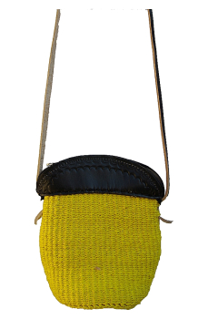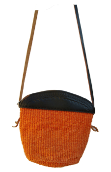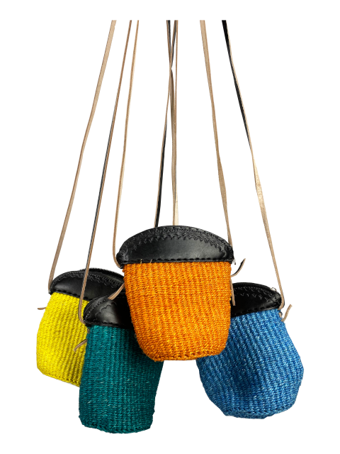 Umhängetasche aus der Agavenfaser Sisal in Kenia handgefertigt. Robuste und farbenfrohe Verarbeitung mit Lederriemen und Kedereinfassung am Reißverschluß.