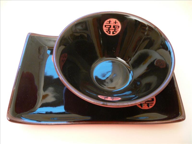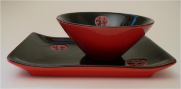 Räucherschale mit Unterteller im rot-schwarzen japanischen Design.