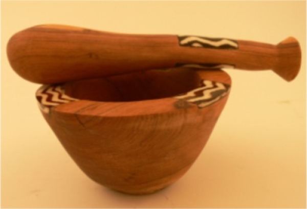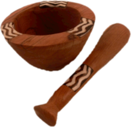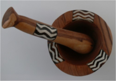 In Kenia handgefertigter Mörser aus Olivenholz. Gebatikte Knochenapplikationen mit verschiedenen afrikanischen Motiven zieren Schale und Stößel. Die Schale hat einen Durchmesser von ca. 12 cm und eine Höhe von etwa 7 cm. Der Stößel ist ca. 19 cm lang und hat einen Durchmesser von bis zu ca 4 cm. Jedes Stück ein Unikat. Form und Farbe der einzelnen Stück sind deshalb unterschiedlich.