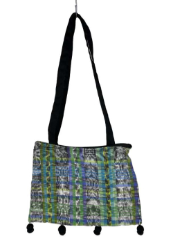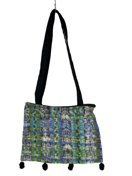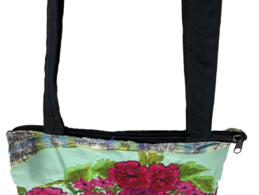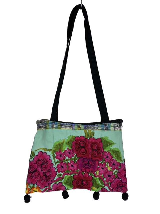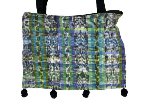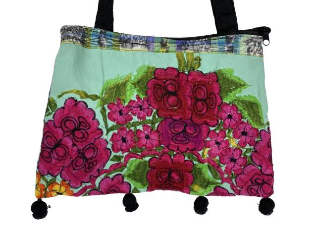 Zur Herstellung der Tasche wurde eine ausgediente Bluse (Huipil) einer Mayafrauen aufgearbeitet. Ein handgesticktes florales Muster mit bunten Blüten und Blättern ziert die Vorderseite. Die Rückseite ist ein Güipiles Stoff. Güipiles heißen die handgewebten Stoffe, die seit jeher von den Frauen der Mayas in Guatemala auf sogenannten Rückenwebstühlen von Hand gewebt werden. Das bunte Streifenmuster ist charakteristisch und regional und örtlich unterschiedlich ausgeprägt.