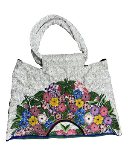Güipiles heißen die Blusen, die traditionell von den Maya-Frauen in guatemala getragen werden. Die Herstellung der Stoffe ist sehr aufwendig und langwierig. Die Frau verwenden dazu die traditionellen Rückenwebstühle. Jeder Stoff ist handgewebt und in Design und Farbe ein absolutes Einzelstück. Die Vorderseite der Tasche ist mit einem floralen Muster großer Blüten bestickt.