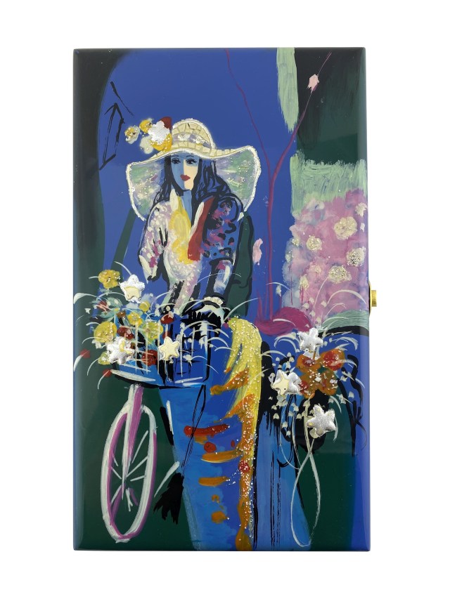 Der Deckel ist kunstvoll von Hand bemalt. Die edle Damen mit Hut und einem Fahrrad mit Blumenkorb verleiht der Dose einen exklusiven Ausdruck.
