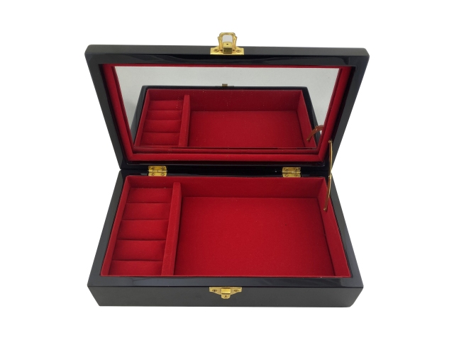 Der Deckel kann mit einer Klappbeschlag verschlossen werden und hat auf der Innenseite einen großen Spiegel. Das Kästchen ist innen mit roten Samtstoff ausgeschlagen. Auf der linken Seite sind 4 Steckfächer für Ringe und daneben ein großes Fach für Ketten, Armbänder oder anderes Schmuckwerk.