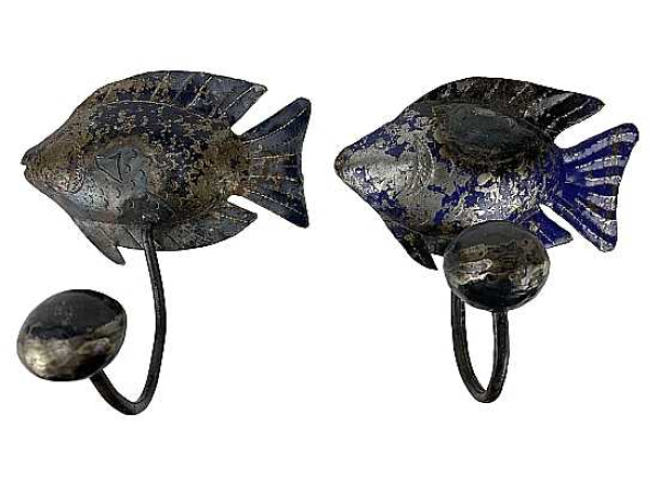 Kleiderhaken mit Fischmotiv. Rohstoff ist Blech von alten Ölfässern. Mit Öse zum Hängen auf der Rückseite. Ca. 15 cm breit, ca. 15 cm hoch und ca.11 cm tief.