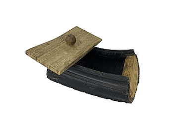 Eine geniale Fusion aus einem modernen und einem traditionellen Rohstoff: Unsere Reifenbox wird aus alten Reifen und robustem Fraké-Holz gefertigt. Ganz nach den Prinzipien des Upcyclings wird hier ein einzigartiges Designstück in ressourcenschonendem Verfahren angefertigt. Ideal zum Verstauen kleinerer Gegenstände, ob in der Werkstatt oder im Büro!