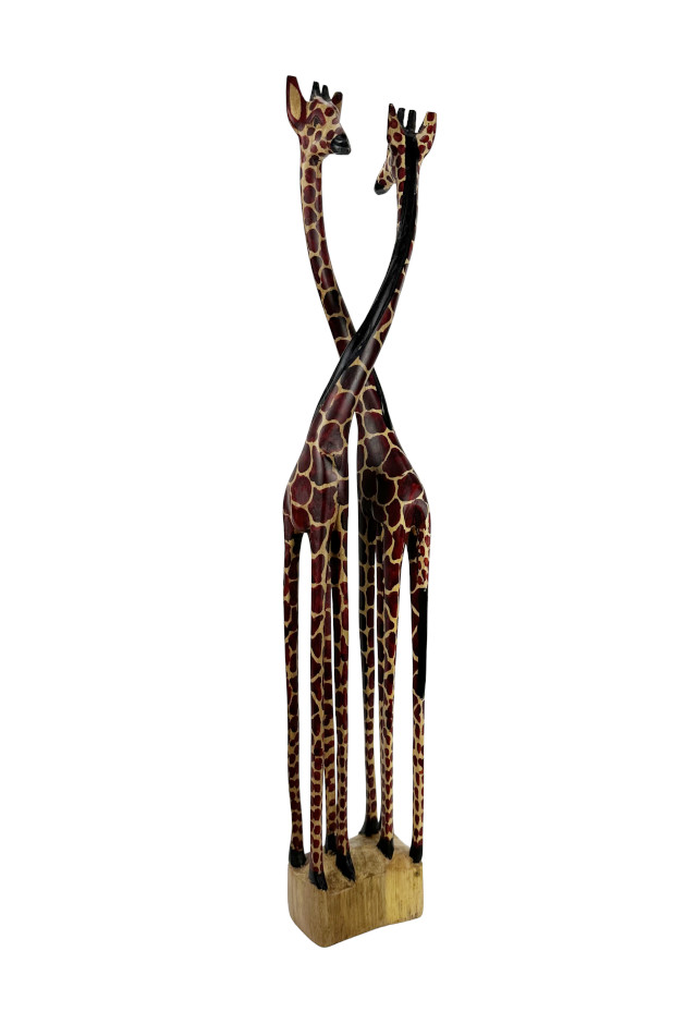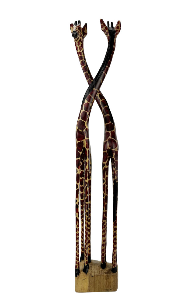 Von Hand aus einem Stück Jacarandaholz geschnitztes Giraffenpaar, das eng verschlungen beieinander steht. Schöne naturgetreue Zeichnung. Die Figur ist ca. 47 cm hoch, etwa 7 cm tief und ca 8 cm breit.