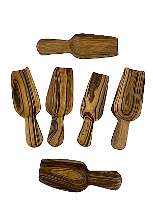 Von Hand in Kenia aus Olivenholz geschnitzer Gewürzlöffel. Ideale Schaufelform. Phantastisch gemasertes Holz und gutes handwerkliches Finish. Jeder Löffel ist ein einzigartiges Schmuckstück.