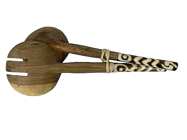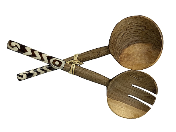 Wunderschönes Salatbesteck aus Olivenholz. In Kenia von Hand geschnitzt. Der Griff ist aus gebatiktem Knochen und mit verschiedenen afrikanischen Mustern dekoriert. Ein echter exotischer Blickfang in Küche und auf dem gedeckten Tisch. Absolut alltagstauglich für die kleine Freude an jeden Tag.