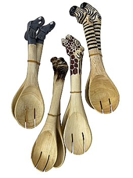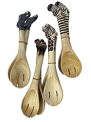 In Kenia von Hand aus dem Holz des Jacarandabaumes geschnitztes Salatbesteck. Der Griff ist mit einem stilisiertem Tierkopf verziert. Zur Reinigung empfehlen wir ausschließlich Handspülung. Keinesfalls in die Spülmaschine geben. Reiben Sie das Salatbesteck zur nachhaltigen Pflege gelegentlich mit etwas Salatöl ein. Länge ca. 30 cm, Durchmesser der Schaufel etwa 7 cm und Dicke des Stieles ca. 2 - 2,5 cm.