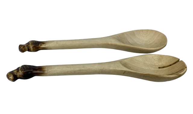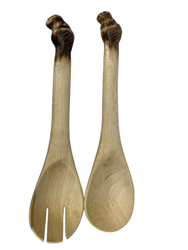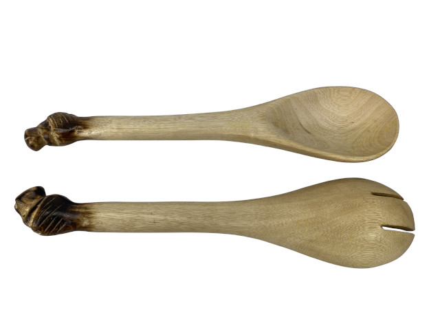 In Kenia von Hand aus dem Holz des Jacarandabaumes geschnitztes Salatbesteck. Der Griff ist mit einem stilisiertem Löwenkopfkopf verziert. Zur Reinigung empfehlen wir ausschließlich Handspülung. Keinesfalls in die Spülmaschine geben. Reiben Sie das Salatbesteck zur nachhaltigen Pflege gelegentlich mit etwas Salatöl ein. Länge ca. 30 cm, Durchmesser der Schaufel etwa 7 cm und Dicke des Stieles ca. 2 - 2,5 cm.