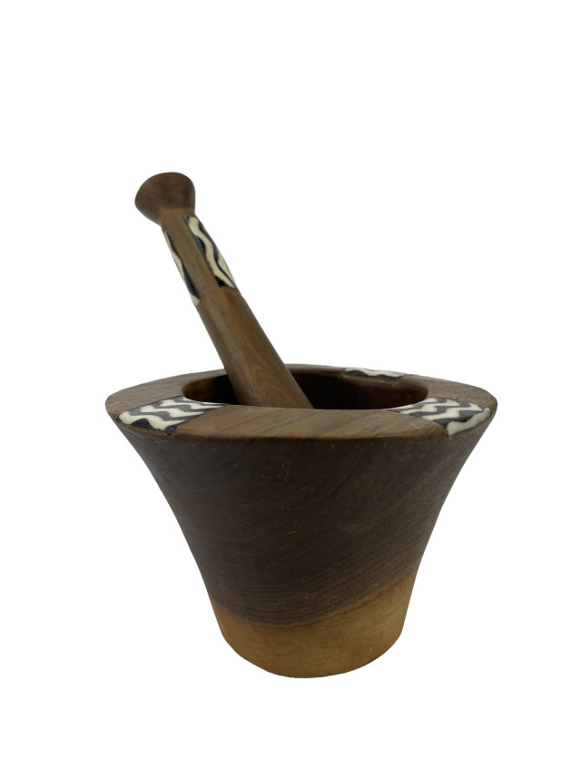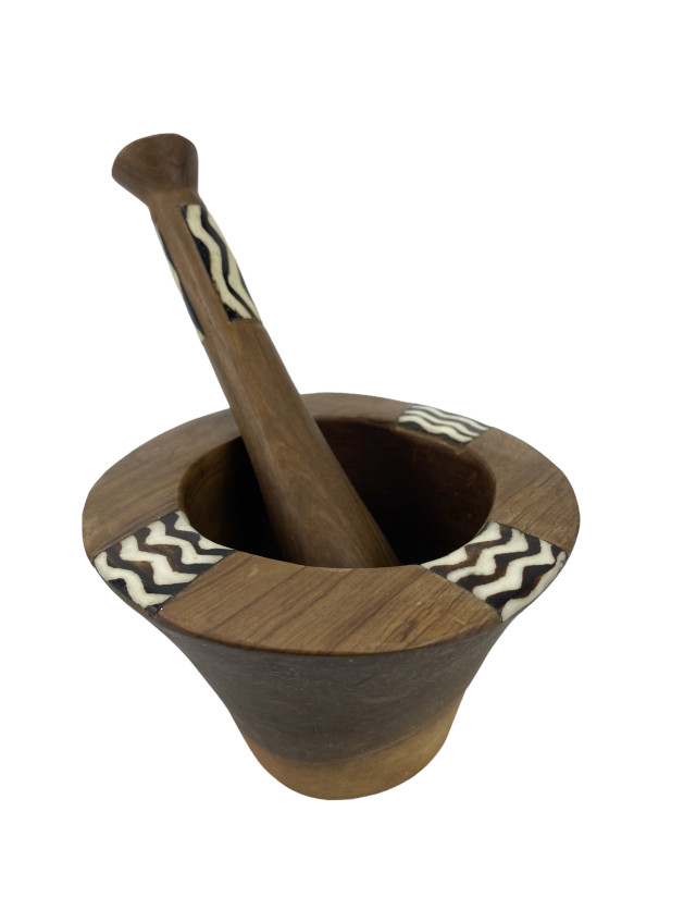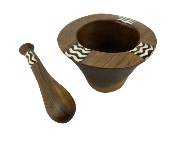 In Kenia handgefertigter Mörser aus Olivenholz. Gebatikte Knochenapplikationen mit verschiedenen afrikanischen Motiven zieren Schale und Stößel. Die Schale hat einen Durchmesser von ca. 12 cm und eine Höhe von etwa 7 cm. Der Stößel ist ca. 19 cm lang und hat einen Durchmesser von bis zu ca 4 cm. Jedes Stück ein Unikat. Form und Farbe der einzelnen Stück sind deshalb unterschiedlich.