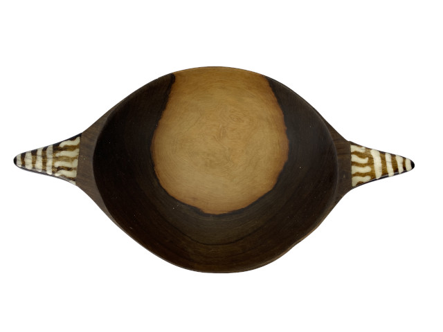Sehr dekorative ovale Schale mit zwei Griffen, die mit Knochenbatiken verziert sind. Breite 26 cm, Tiefe 13,5 cm und Höhe 5 cm. Als Handarbeit aus Naturmaterial ist jedes Stück einzigartig.