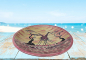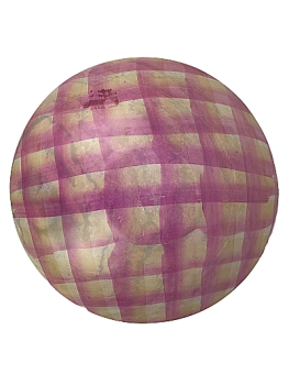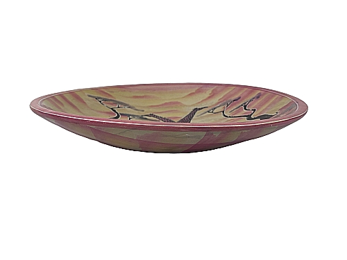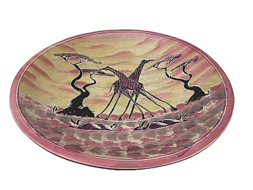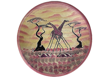 Die handgeschnitzte runde Schale wurde in den 1990iger Jahren in Kisii, Kenia aus Speckstein geschnitzt. Die Schale ist bemalt. Vor einem Hintergrund von Rot- und Gelbtönen sind zwei Giraffen, die die Blätter von Bäumen fressen, dargestellt. Das Design wurde mit einem Messer eingeritzt, um den Kontrast zwischen dem Naturstein und den Farben zu erhalten. Die Unterseite mit einem rötlichen gelben Streifenmuster bemalt.