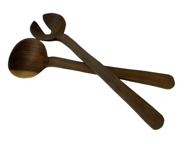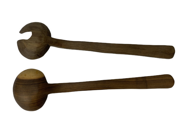 Schönes handgeschnitztes Salatbesteck aus naturbelassenen Olivenholz, das nur mit etwas Olivenöl eingelassen wurde. Dekoratives afrikanisches Accessoire aus Kenia für die Küche und den gedeckten Tisch.