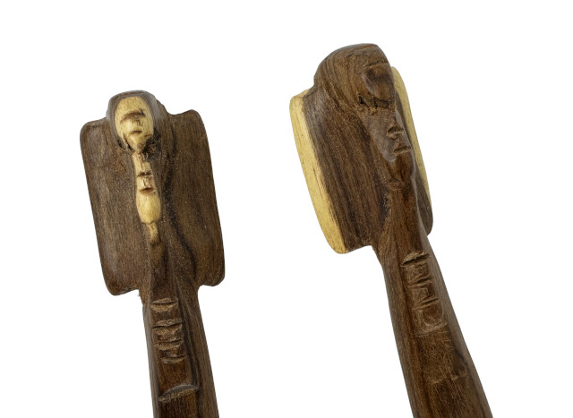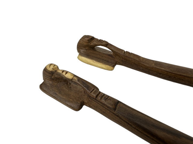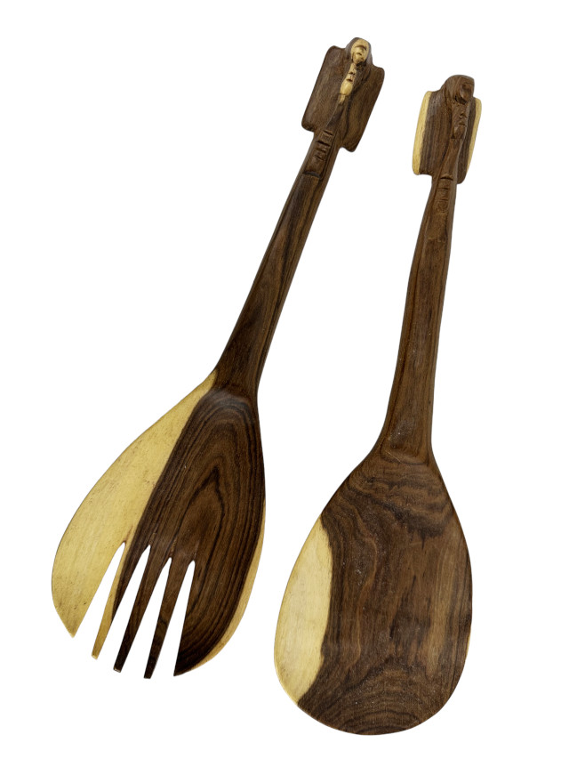 Aus Rosenholz in Kenia von Hand geschnitztes Salatbesteck. Der Griff ist als Elefantenkopf ausgearbeitet. Ein dekorativer Blickfang für Ihre Tafel. Zum Alltagsgebrauch geeignet.