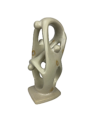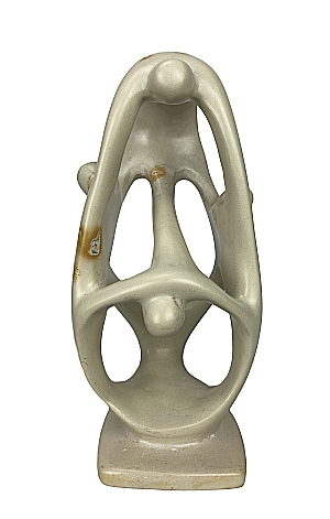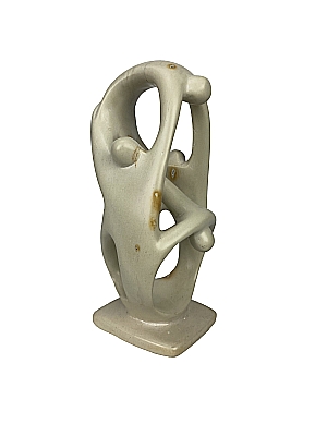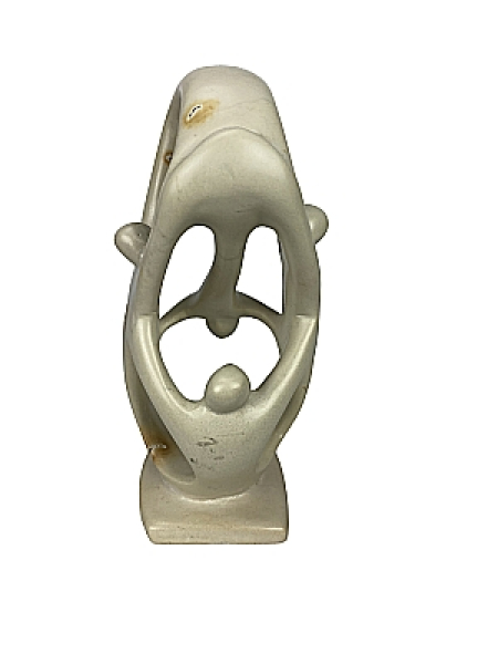 Kleine handgefertigte Specksteinfigur aus Kissi in Kenia. Artistengruppen, die Menschenpyramiden bilden, haben in Kenia eine lange Tradition. Die sehr stylisiert aiusgearbeitete Skulptur drückt das Gelingen durch gegenseitiges Stützen und Halten aus. Höhe ca. 14 cm.