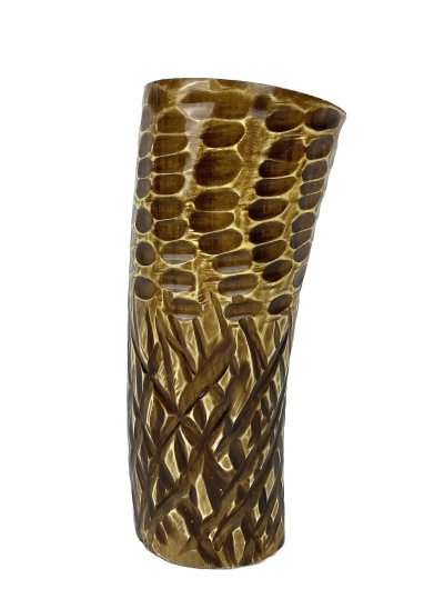 Ein natürliches Mittelstück Horn wird gereinigt, sorgfältig geschliffen und poliert. Außen hat der Künstler ein abstraktes grafisches Muster geschnitzt und in verschiedenen Brauntönen bemalt. Im unteren offenen Teil wurde eine entsprechende Hornplatte perfekt eingepasst. Anschließend ist die Vase mit einem Klarlack versiegelt worden.