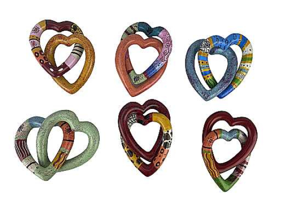 Mit traditionellen Werkzeugen von Hand geschnitzte verschlungene Herzen. Sie werden aus einem Stück Stein in Handarbeit zu einem Kunstwerk verwandelt. Dazu benötigen die Schnitzer nur 30 Minuten um den Rohling herzustellen. Danach wird er geschliffen, bemalt und mit Wachs poliert. Eine Meisterleistung in Sachen Handarbeit.