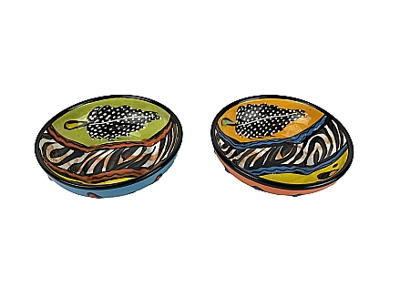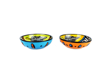 Handbemalte Schale aus bis 1200° Grad hochgebrannter Keramik. Sie ist sowohl spulmaschinenfest als auch für die Mikrowelle geeignet. Durchmesser ca. 9 cm und Höhe ca. 3 cm. Von Künstlern aus Kapstadt in Südafrika hergestellt und signiert.
