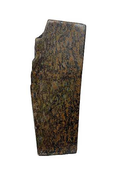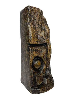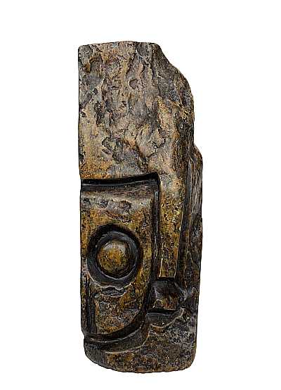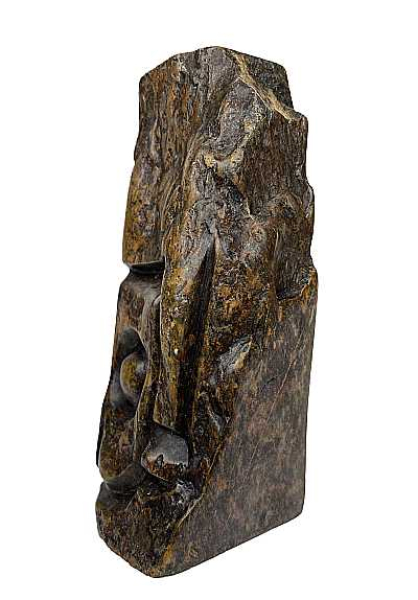 Das abstrakte Halbgesicht ist aus braunem Serpentin geschnitzt. Außergewöhnlich ist der Kontrast zwischen der ausgearbeiteten linken Gesichtshälfte und der naturbelassenen rechten.