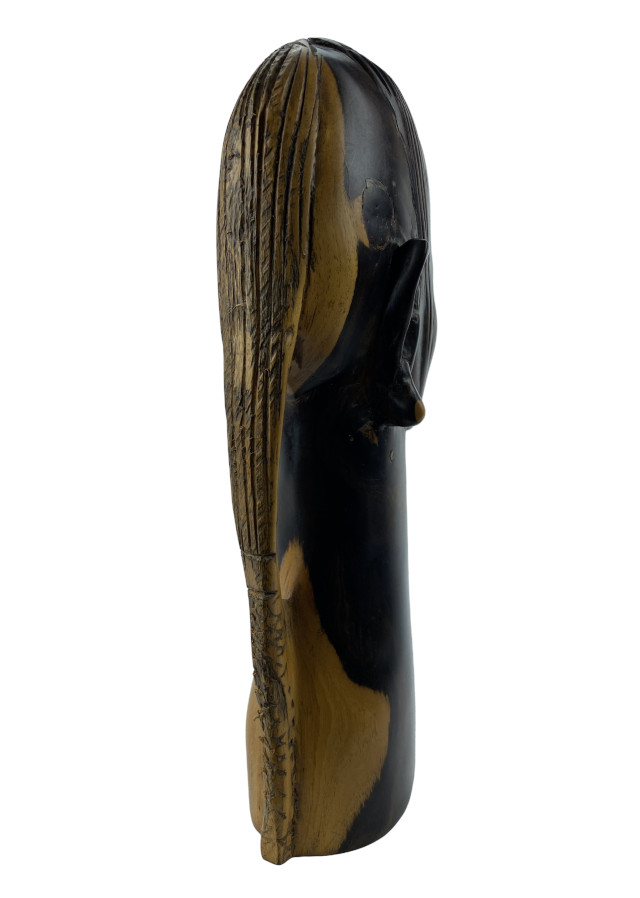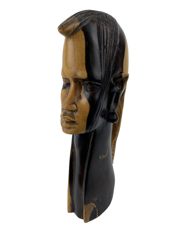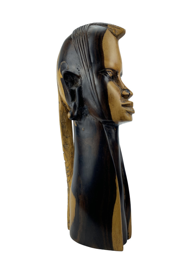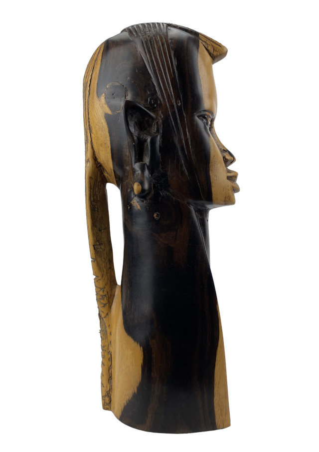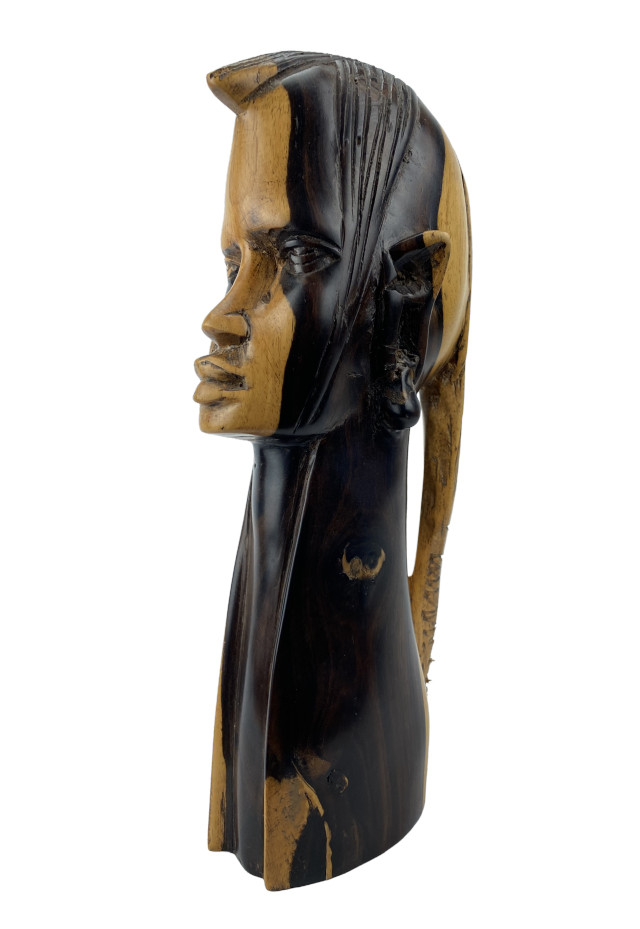 Schöne Ebenholzfigur eines afrikanischen Kopfes. Der Schnitzer hat bei dieser Skulptur die Zweifarbigkeit des Holzes genutzt um einen dekorativen Kontrast zu erzeugen. Fein gearbeitet und glatt poliert mit edler Ausstrahlung.