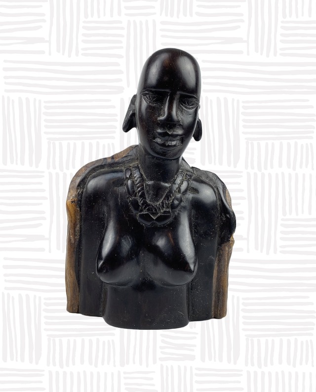 Schöne Ebenholzbüste einer Massaifrau. Handgeschnitzt in Tansania. Bei der Figur kommt sehr schön die Zweifarbigkeit des Ebenholzes zur Geltung. Die Front ist aus dem schwarzen Kernholz herausgeschnitzt und poliert. Auf der Rückseite sieht man Teile des braunen Außenholzes. Die Rückseite ist im unteren Bereich nur grob herausgearbeitet und stilisiert so den Kleiderwurf eines Umhanges.