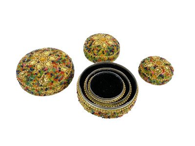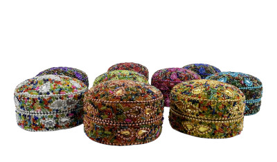 Set aus 3 bunten Glitterdosen in verschiedenen Farben erhältlich. Die Dosen sind mit einem floralen Muster aus bunten Perlen dekoriert. Innen mit schwarzem Samt ausgeschlagen. Die jeweils nächst kleinere Dose passt in die jeweils nächst größere.