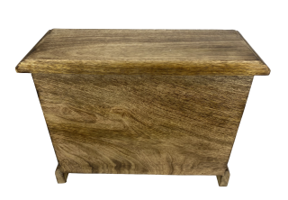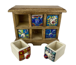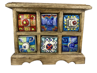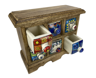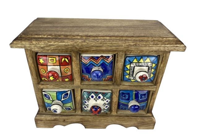 Kleines Schränkchen mit 6 Keramikschubladen. Hergestellt aus Mangoholz mit handbemalten Schubladen aus Keramik. Die kleine Kommode ist etwa 19 cm hoch, ca. 25 cm breit und etwa 10 cm tief.