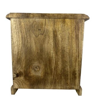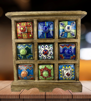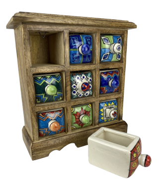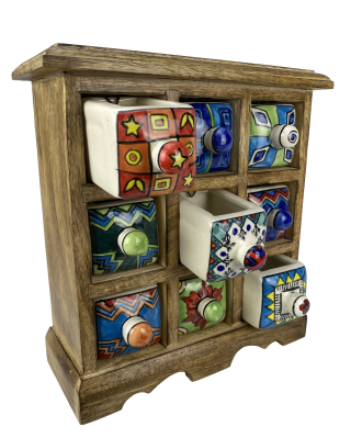Kleines Schränkchen mit 9 Keramikschubladen. Hergestellt aus Mangoholz mit handbemalten Schubladen aus Keramik. Die kleine Kommode ist etwa 26 cm hoch, ca. 26 cm breit und etwa 10 cm tief.