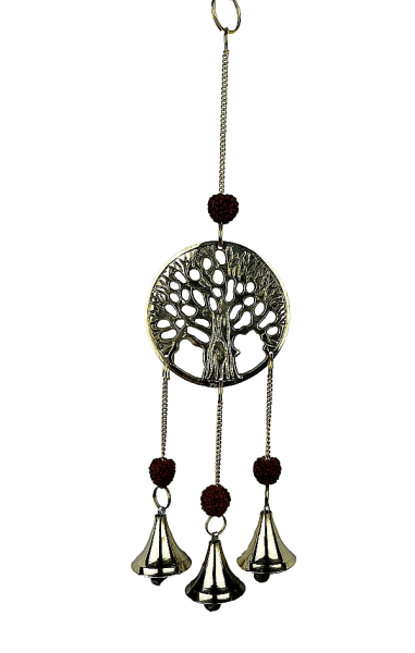 Aus Messing gefertigte Glockenkette mit Lebensbaumsymbol und Rudrakshasamen verziert. Mit drei zart klingenden Messingglöckchen.