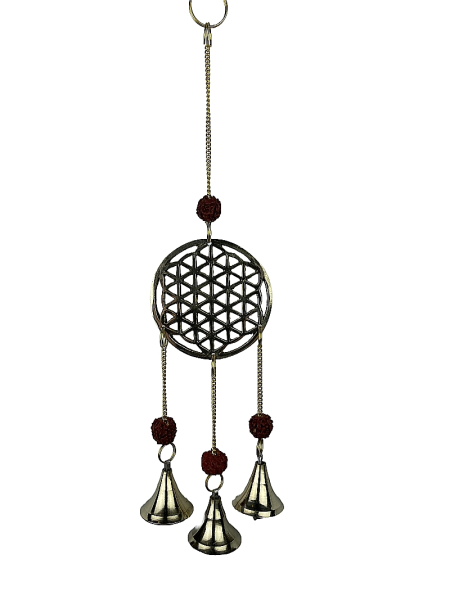 Glockenkette mit der Blume des Lebens. Mit Kette zum Aufhänger. Am Symbol hängen 3 Messingglöckchen mit jeweils einem Rudrakshasamen darüber.