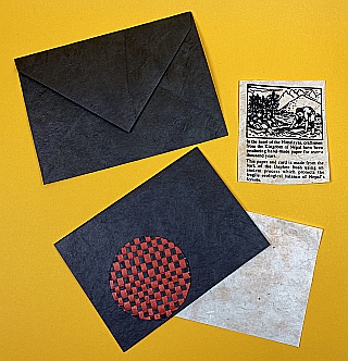 Schönes Briefset aus handgeschöpften Loktappapier, dass in Nepal traditionell aus der Rinde des Daphnestrauches hergestellt wird. Das Set besteht aus einer Klappkarte (ca. 10,5 x 15 cm), die mit einem gefochtenen Kreis verziert ist, einem innenliegenden hellen Bogen (ca. 14,5 x 10 cm) als Schreibfläche für den Brief und einem passenden Umschlag (ca. 16,5 x 12 cm).