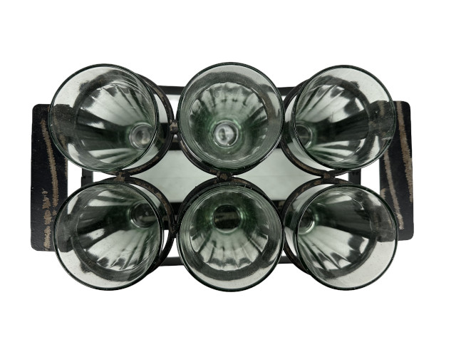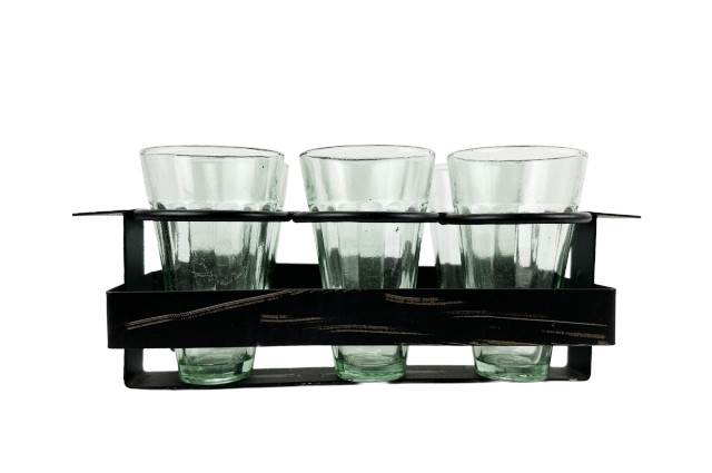Rechteckiger Chai Träger mit 6 schönen indischen Chai Gläsern. Größe ca. 26,5 x 15 x 11,5 cm. Die konischen Gläser haben oben einen Durchmesser von ca. 6,5 cm und eine Höhe von etwa 11 cm.