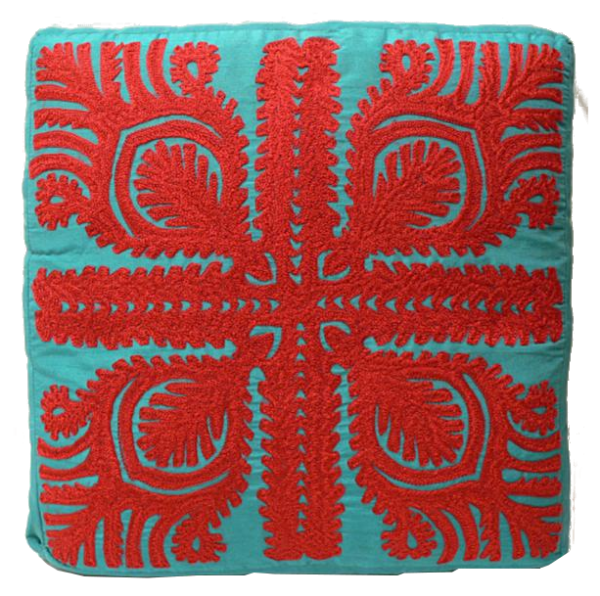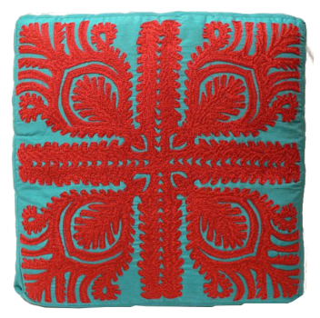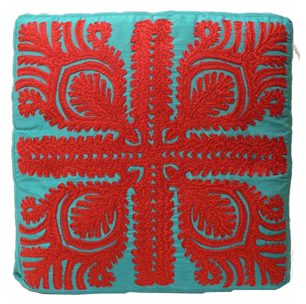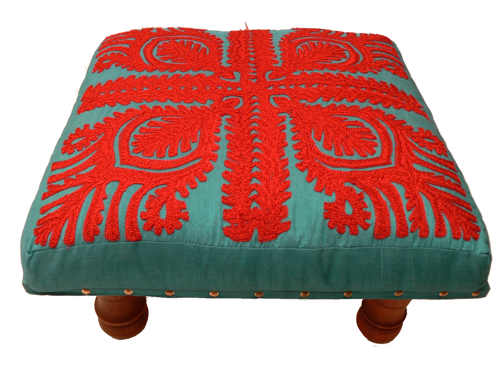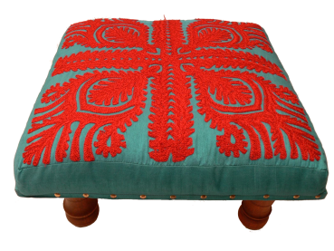 Sehr dekorativer Hocker mit einem schön bestickten Baumwollbezug und einer Füllung aus Rohbaumwolle. Ein echtes Schmuckstück für jede Wohnung. Größe Der Sitzfläche ist 40 x 40 cm. Höhe ca. 22 cm.