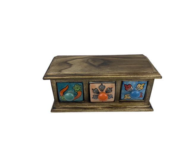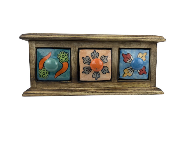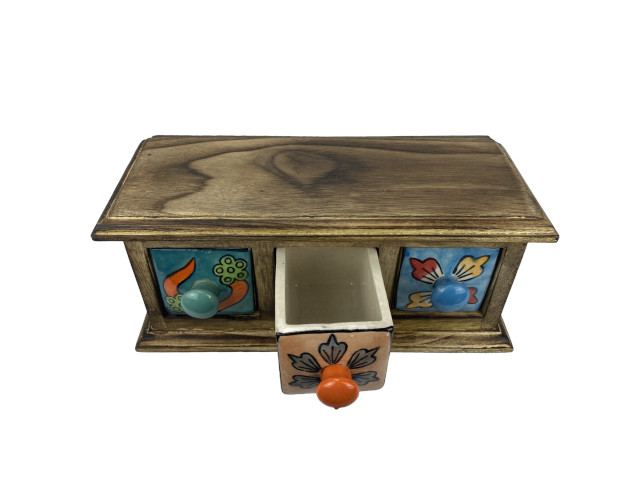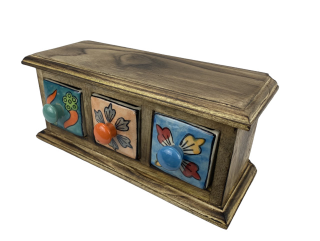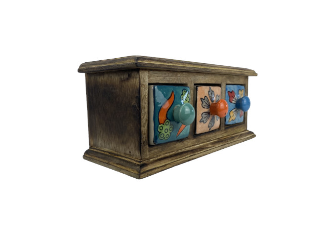 Dieses kleine Schubfachschränkchen aus Shishamholz hat 3 kleine von Hand bemalte Keramikfächer (6*6*8 cm). Da jedes einzelne Fach liebevoll und individuell von Hand gestaltet wurde ist jedes Stück ein Unikat.