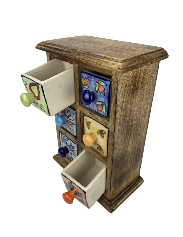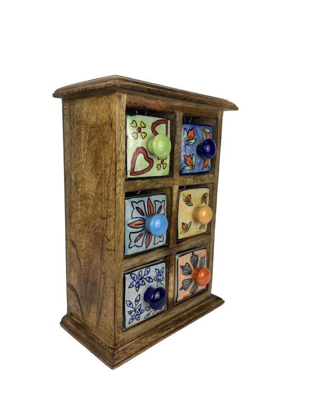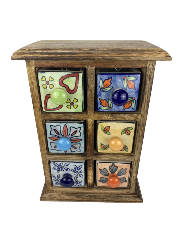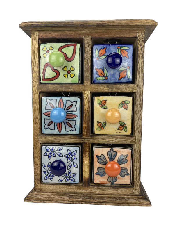 Dieses kleine Schubfachschränkchen aus Shishamholz hat 6 kleine von Hand bemalte Keramikfächer (6*6*8 cm). Da jedes einzelne Fach liebevoll und individuell von Hand gestaltet wurde ist jedes Stück ein Unikat.