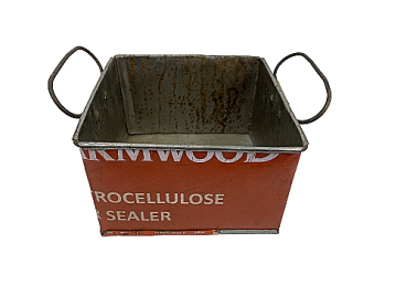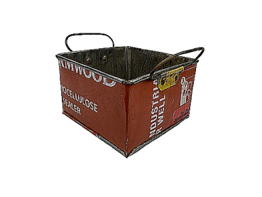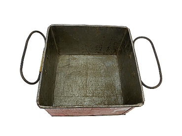 Handgefertigte Metalldose aus aus Blech von alten Kanistern. Mit zwei an den Seiten angebrachten Tragebügeln. Größe: ca. 16,5 x 16,5 x 10,5 cm
