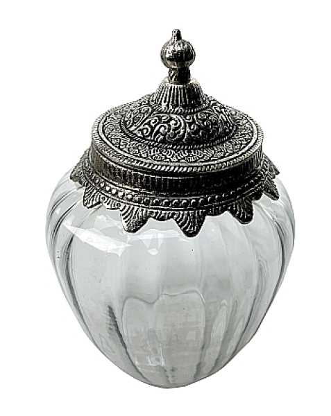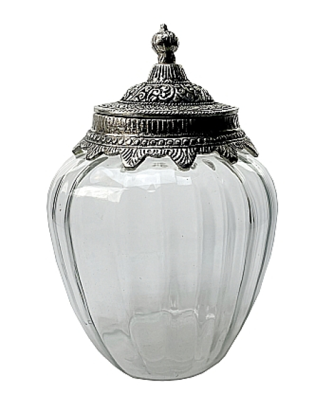 Nachbildung einer klassischen Bonboniere aus der Zeit zu Beginn des 20. Jahrhunderts. Aus klarem Glas gefertigt mit einem Deckel aus reich verziertem Metallkunstguss. Gefüllt mit Süßigkeiten oder anderen Kleinigkeiten eine wunderbare Geschenkidee. Durchmesser ca. 14,5 cm und 22 cm hoch.