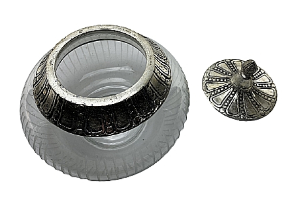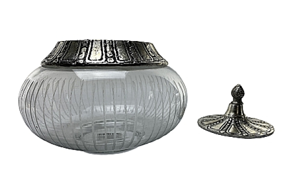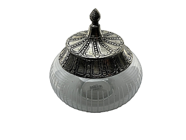 Bonboniere aus Glas mit reich verziertem Deckel aus Metallkunstguss. Schöne Dekoration für Küche, Bad und Wohnzimmer. Die Geschenkidee für Freunde des schönen Wohnens. Größe: 18 x 18 x 17 cm.