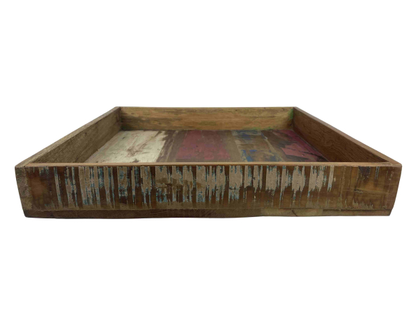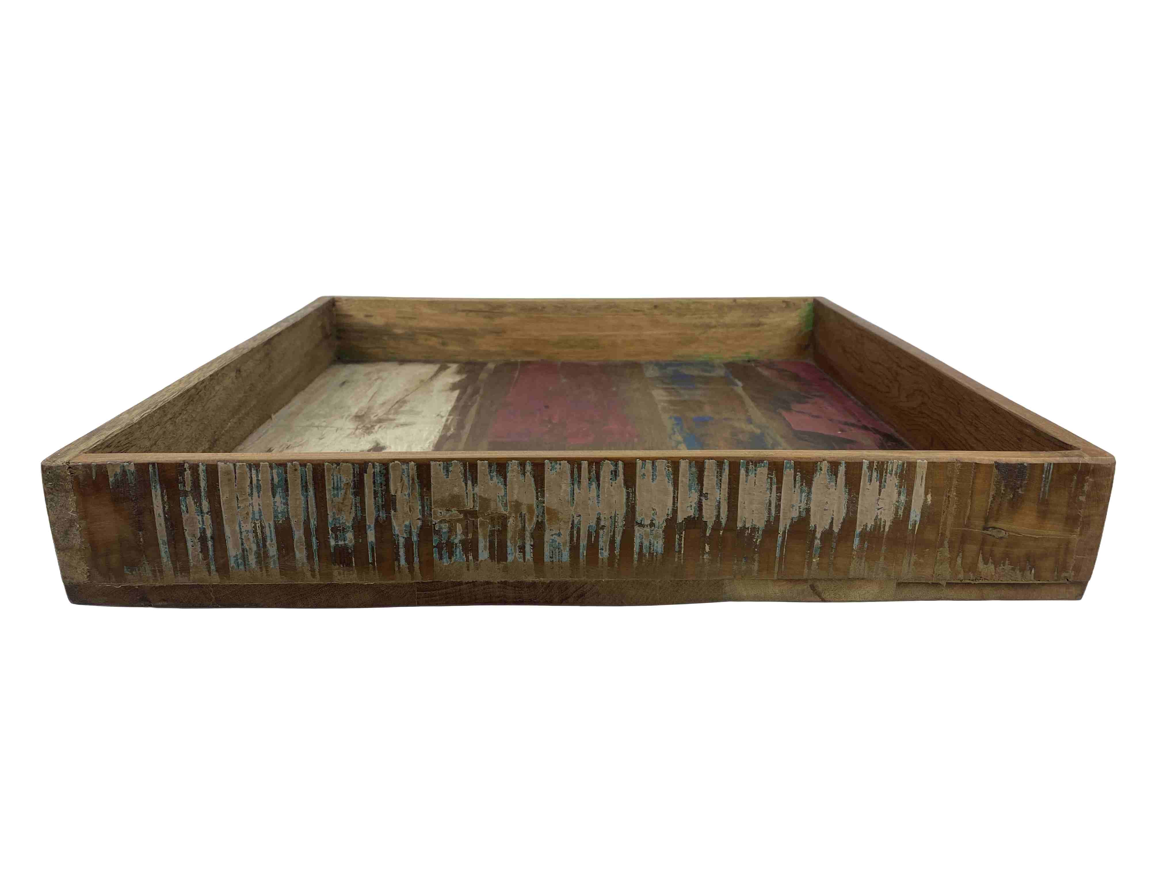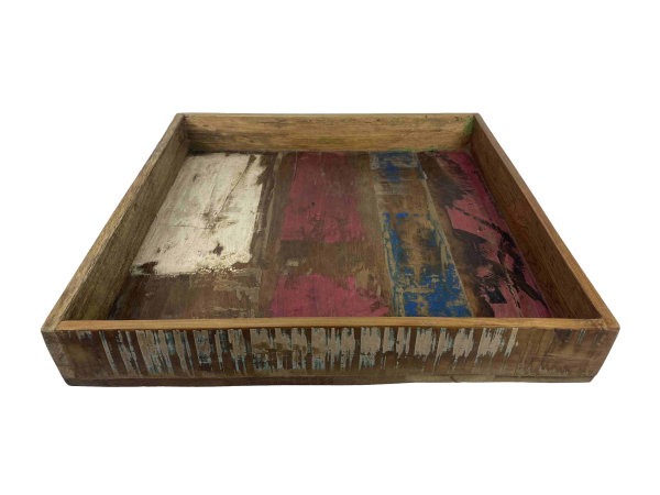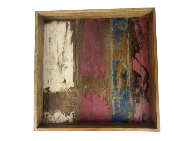 Quadratisches Tablett aus altem Teak Holz gefertigt. Extravagantes Tablett aus lackiertem Altholz. Durch Farbrückstände auf dem Holz entsteht ein einzigartiger Look. Jede Oberfläche erzählt eine Geschichte.
