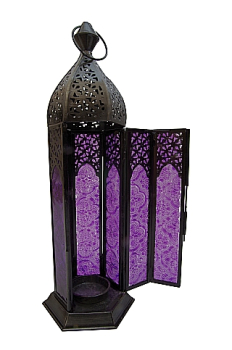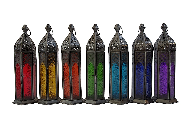 Orientalische Eisenlaterne mit 6 bunten Ornamentgläsern. Als Standlaterne oder mit Ring zum Aufhängen. Die Beleuchtung erfolgt mit einem handelsüblichen Teelicht. Das bunte Glas und die Perforationen im Metall schaffen eine exotische und romantische Lichtatmosphäre. Die Laterne hat einen Durchmesser von ca. 9 cm und eine Höhe von etwa 28 cm.