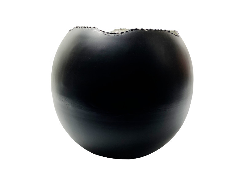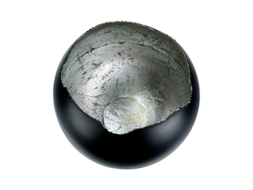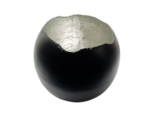 Großes Windlicht aus Metall, außen schwarz lackiert und innen mit einer edel glänzenden silbernen Metallicbeschichtung. Durchmesser ca 28 cm und Höhe ca. 26 cm.