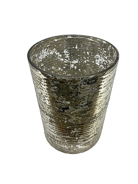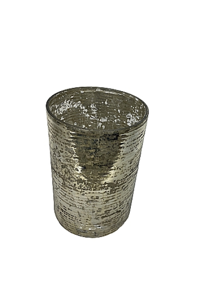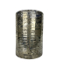 Großes Windlicht aus Glas mit Bauernsilber belegt.
