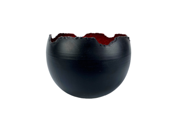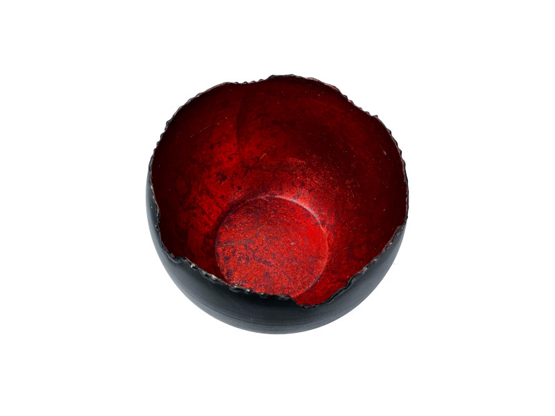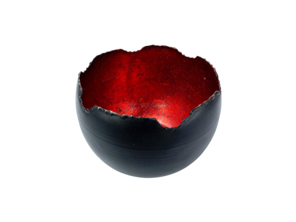 Windlicht aus schwarz lackiertem Metall, innen mit einer edel glänzenden roten Metallicbeschichtung. Durchmesser ca. 18 cm und Höhe ca. 12 cm.